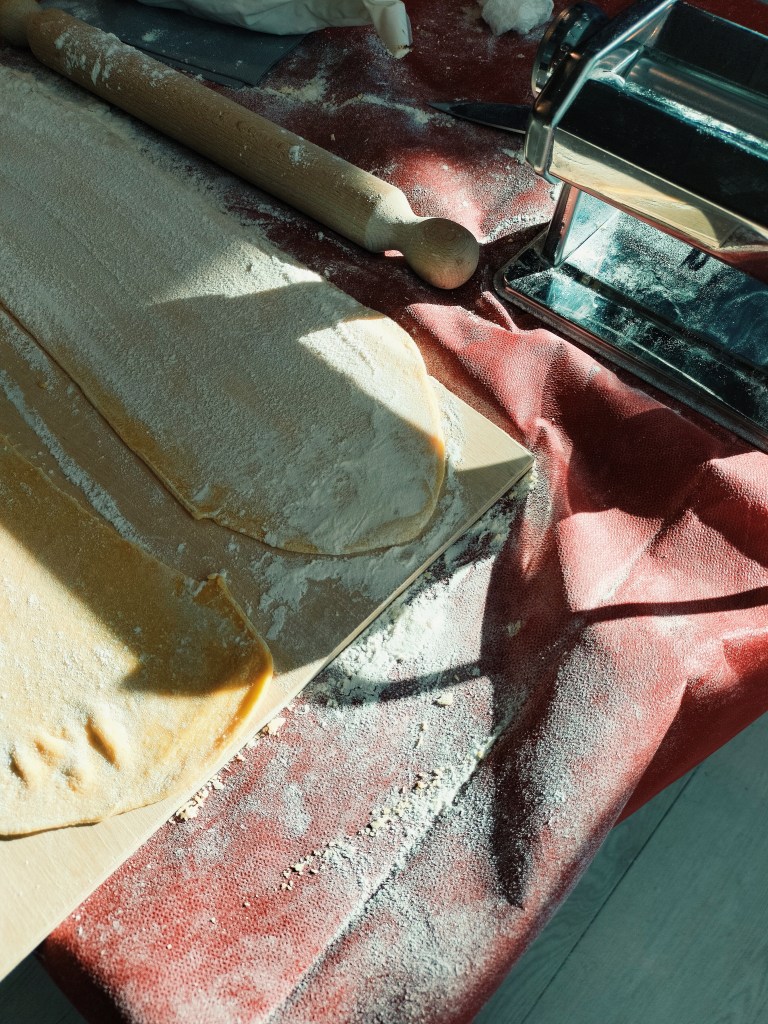 Mentre lasciamo che il dolce si riposi in frigo, è la volta di fettuccine e ravioli. Per realizzare un impasto coi fiocchi ho scoperto che sono necessari due ingredienti principe quali dedizione e divertimento. Tra un’infarinatura e l’altra il tempo sembra volare e vedere come il piatto prende forma è una delle cose che più mi affascina. La parte più difficile sta nel decidere come condire la pasta scegliendo tra varie gustose opzioni come quattro formaggi, sugo e basilico, carbonara e pesto.