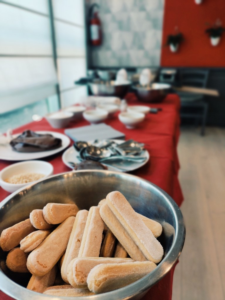Partiamo con la preparazione del tiramisù: ognuno lo realizza all’interno di una tazza decorandolo a proprio piacere. L’atmosfera si scalda, i sorrisi non mancano. Seguiamo i passaggi che ci