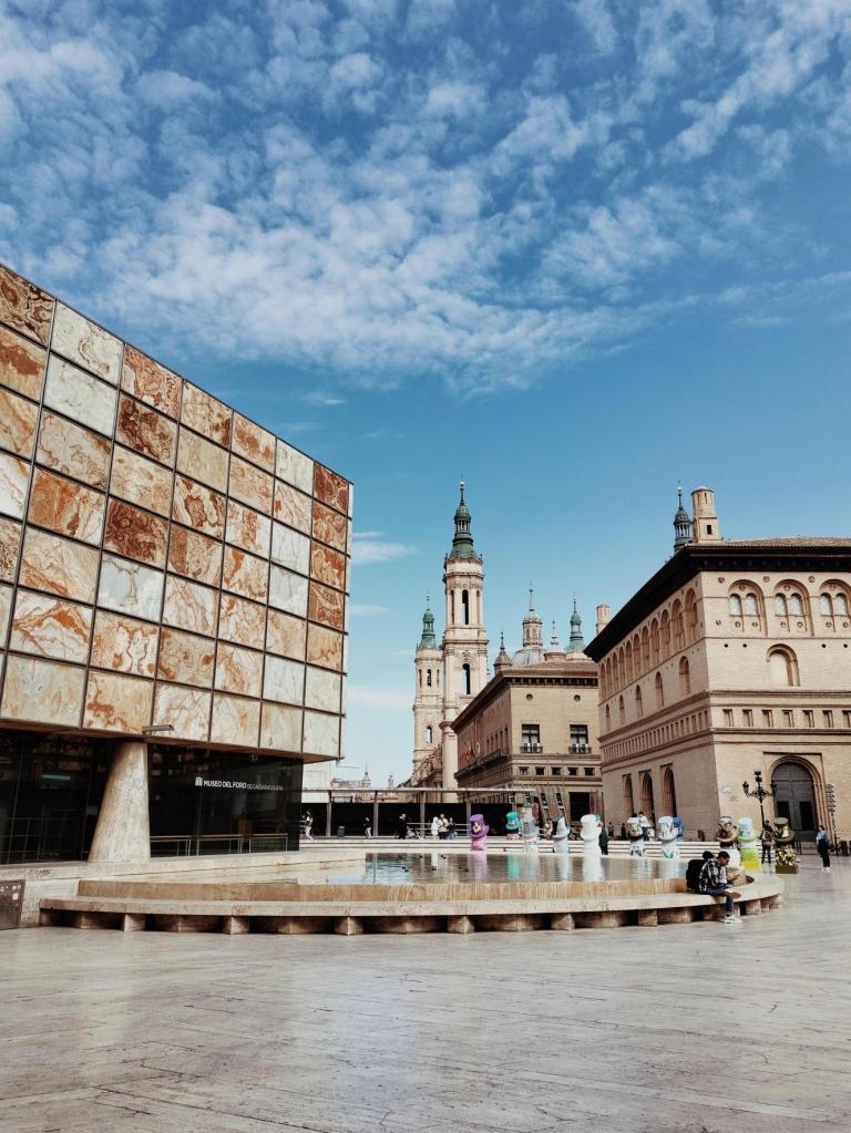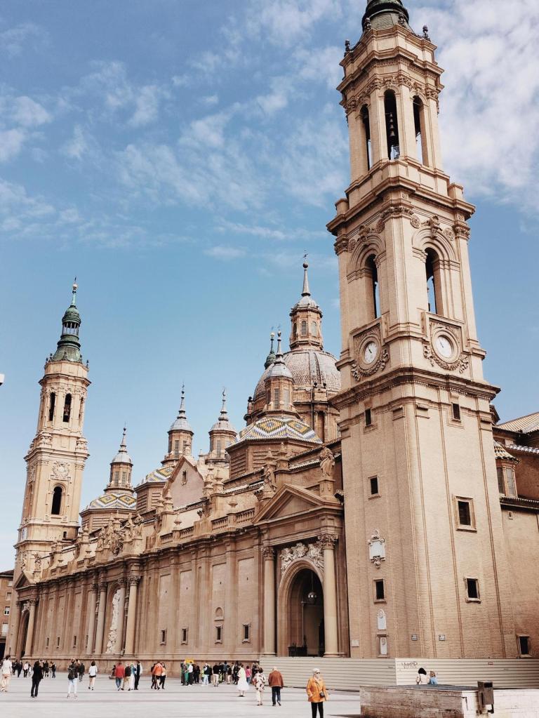 Partiamo dalla cattedrale e dalla sua splendida Plaza de Nuestra Señora del Pilar: sono pazzesche, l’una dà luce all’altra mettondosi in risalto senza oscurarsi. La maestosità della chiesa la si coglie sia quando ti trovi ai suoi piedi sia quanto la vedi a chilometri di distanza mentre cammini lungo le rive del fiume Ebro. Spicca come un fiore del deserto e merita di essere guardata con gli occhi che esprimono la gioia di ritrovarsi davanti a cotanta bellezza, sia di giorno che di sera.