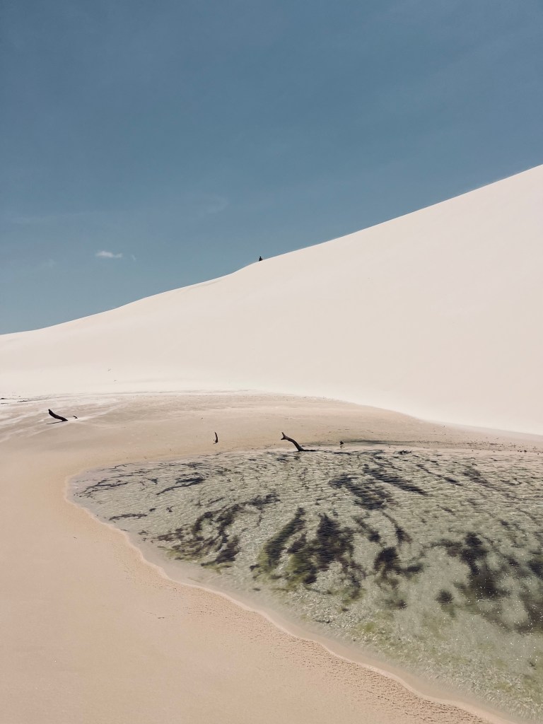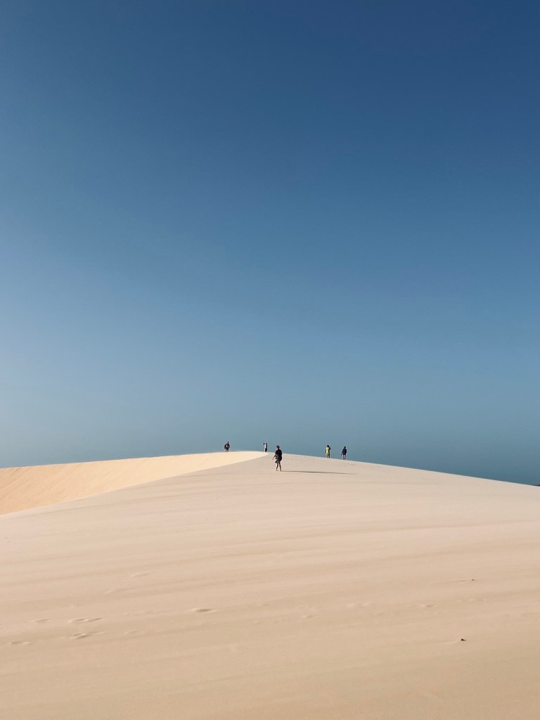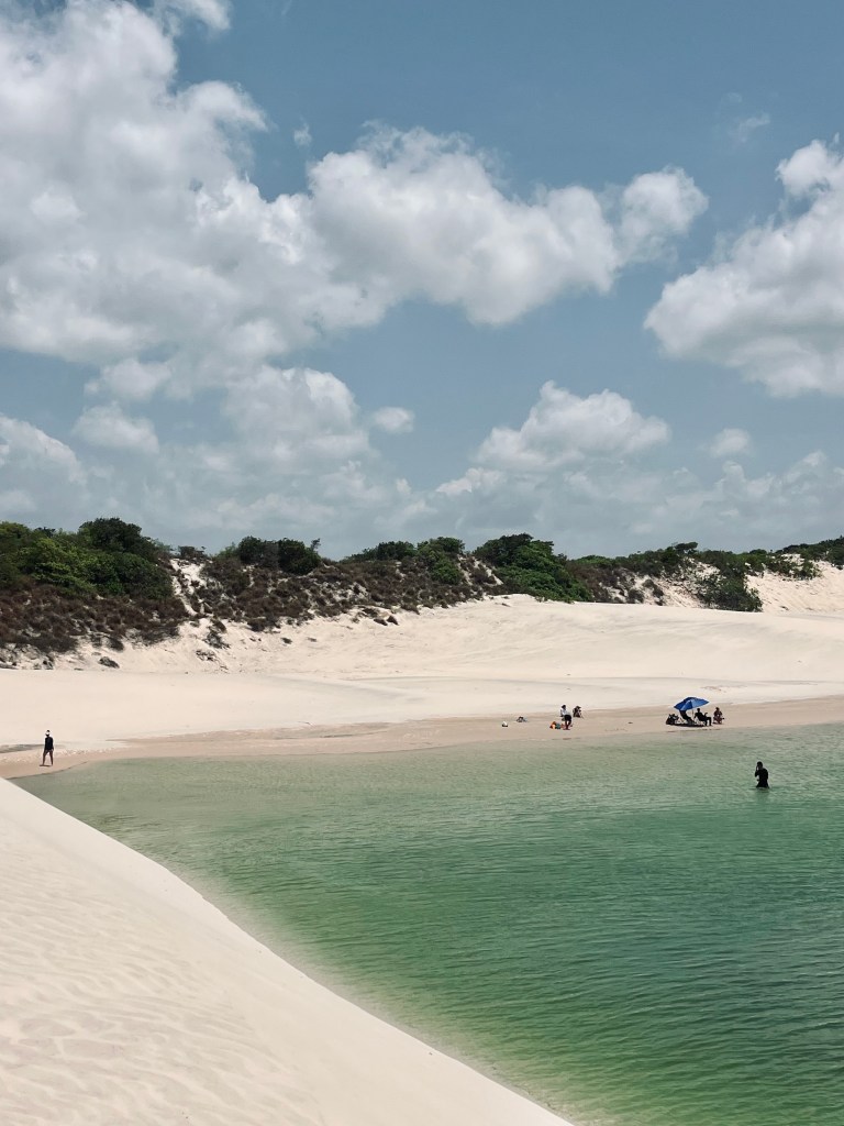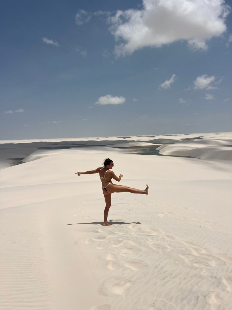 Sono alle porte di quella che si prospetta la vera attrattiva del viaggio: il parco nazionale dei Lençóis Maranhenses. Tra sentieri naturali e selvaggi, raggiungo la riserva naturale a bordo di un 4×4 dopo una manciata d’ore: al termine di una scarpinata per arrivare sulla vetta di una ripida duna si apre una distesa infinita di sabbia bianca intervallata da pozze d’acqua piovana che si deposita nelle depressioni naturali durante la stagione umida. La vista è impattante, da lasciarti senza fiato e da gustarsela con gli occhiali da sole perché la luce risulta quasi accecante. È sicuramente uno dei posti più assurdi che abbia mai visto e non perdo occasione per ribadire che incalza lo scenario che più preferisco: linee sconfinate, dettagli minimali e percezione dell’infinito. Cammino scalza sulla sabbia che sembra farina e raggiungo, tra la carezza del vento e il caldo del sole, la Lagoa Bonita e la Lagoa Azul dove ne approfitto per rinfrescarmi.